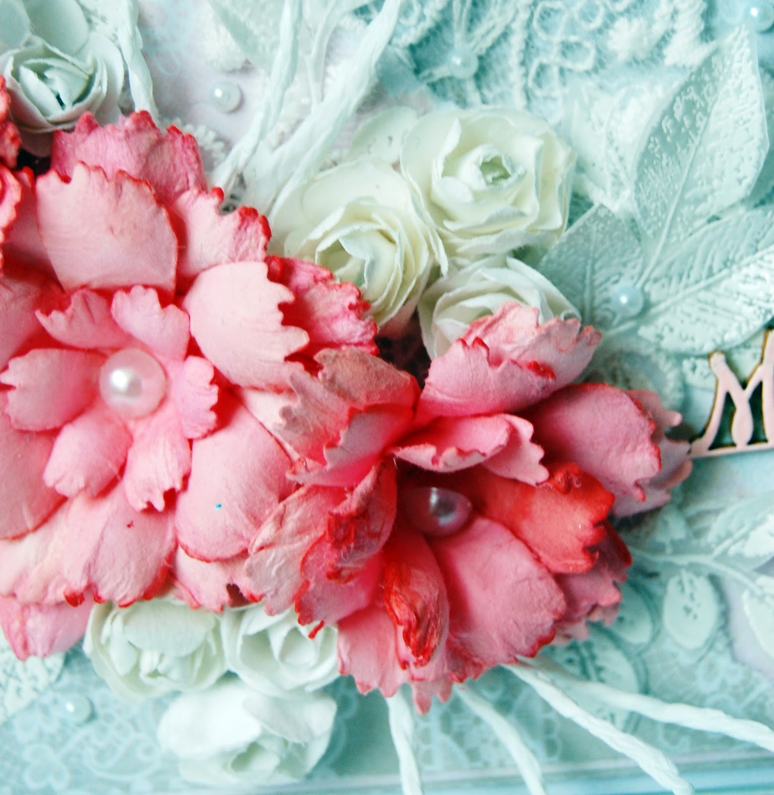 A kartka? leciutka, z delikatnym różem z embossingowego pudru. Dwa sety po 12 kolorów kupiłam na ebay dawno temu. Wcześniej używałam głównie koloru białego i przeźroczystego, nie licząc srebrnego i złotego oczywiście. Teraz korzystam z wielu, również z tych pastelowych :) Tło to prześliczny "Agateriowy" papier z koronkami "Magic Dreams 2/6" ... i jeszcze koronki i stemple stare jak moje skrapowanie odciśnięte na kalce i pociągnięte białym embossingiem. Kwiaty tym razem moje własne, które produkowałam w sporych ilościach w trakcie ferii. Myślę że wyszły rewelacyjnie, choć barwiłam je dosyć typowo, czyli czerwonym distressem.